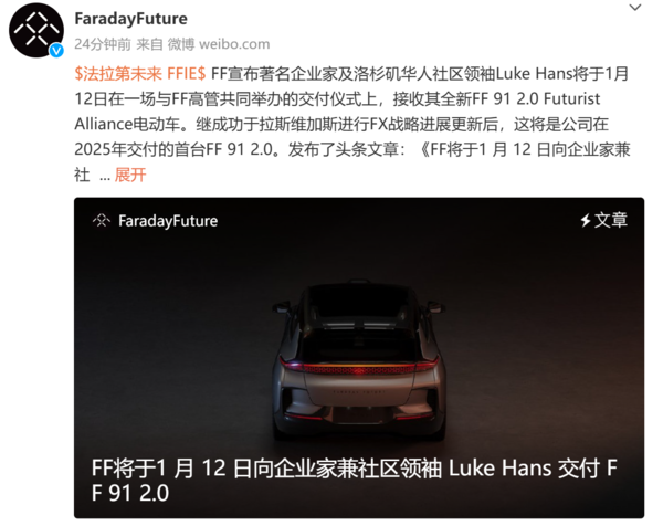 1月10日,法拉第改日(以下简称FF)官方告示,闻明企业家及洛杉矶华东说念主社区首领Luke Hans将于1月12日在一场与FF高管共同举办的委派典礼上,承袭其全新FF 91 2.0 Futurist Alliance电动车。继告捷于拉斯维加斯进行FX政策进展更新后,这将是公司在2025年委派的首台FF 91 2.0。