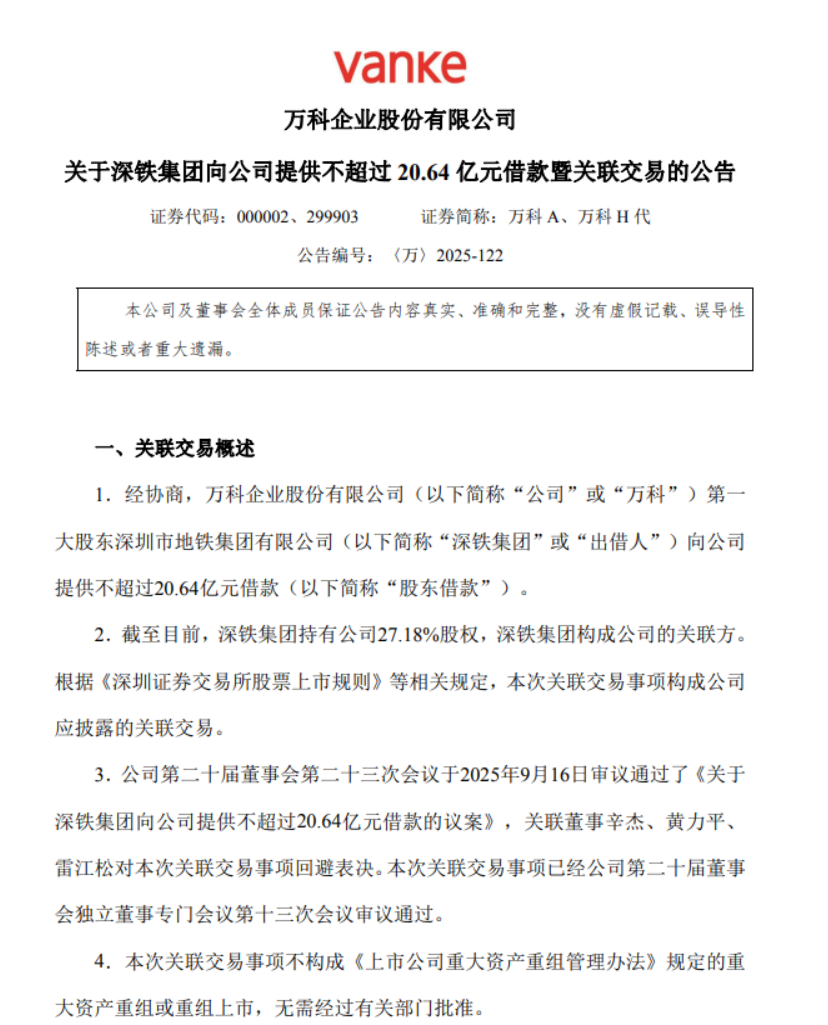 另据公告暴露,深铁集团已累计向公司提供借钱238.77亿元(不含本次借钱)。其中,自公司于2025年6月27日召开2024年度鼓吹大会以来,深铁集团已分批次向公司提供以下款项及斟酌安排:新增借钱62.49亿元、延期借钱8.9亿元、新增借钱8.69亿元并提供金钱抵质押、新增借钱11.89亿元(2025年8月5日董事会审议通过的借钱金额是不特等16.81亿元),以及公司就已有的15.51亿元借钱提供万物云股权质押看成担保。其中62.49亿元借钱和8.9亿元借钱已得回深圳证券来去所欢跃在阐明关联来去是否达到需提交公司鼓吹会审议金额时,豁免累计计较。
