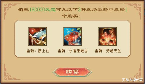 12次解锁坐骑购买,包含永久坐骑:霞上仙,芳遥天坠,水客乘鲤去(18w元宝,三选一)