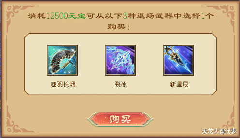 8次解锁幻武购买,包含翎羽长烟,裂冰,斩星辰(1.25w元宝,三选一)