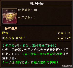 今天是豪恣星期四,细密服元宝商店更新了新说念具乾坤缶。成果即是7天的乾坤壶,价钱亦然560元宝7倍一个。