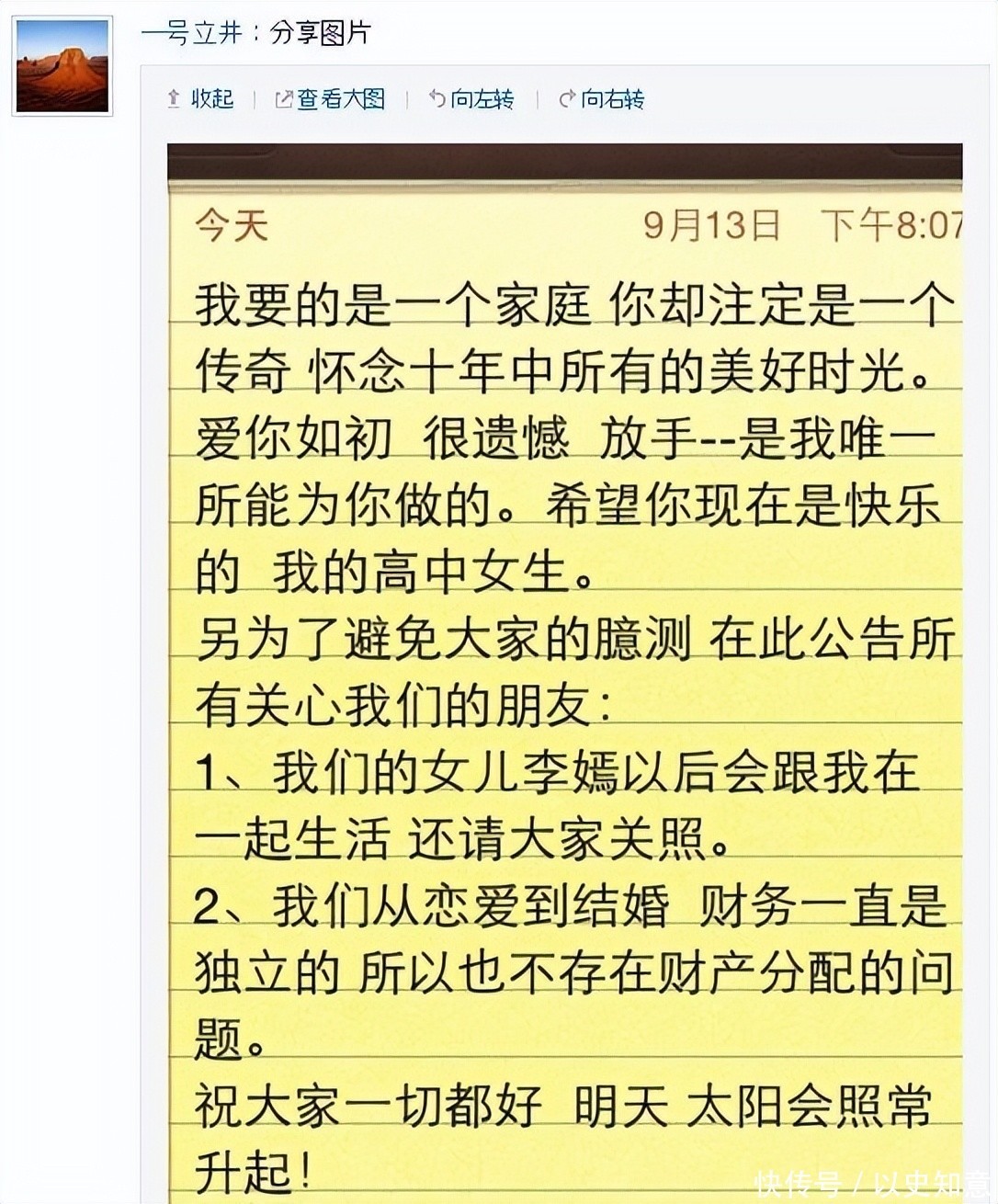 仳离声明中那句经典话语于今被东说念主说起:“我要的是一个家庭,而你注定是一个传奇。”