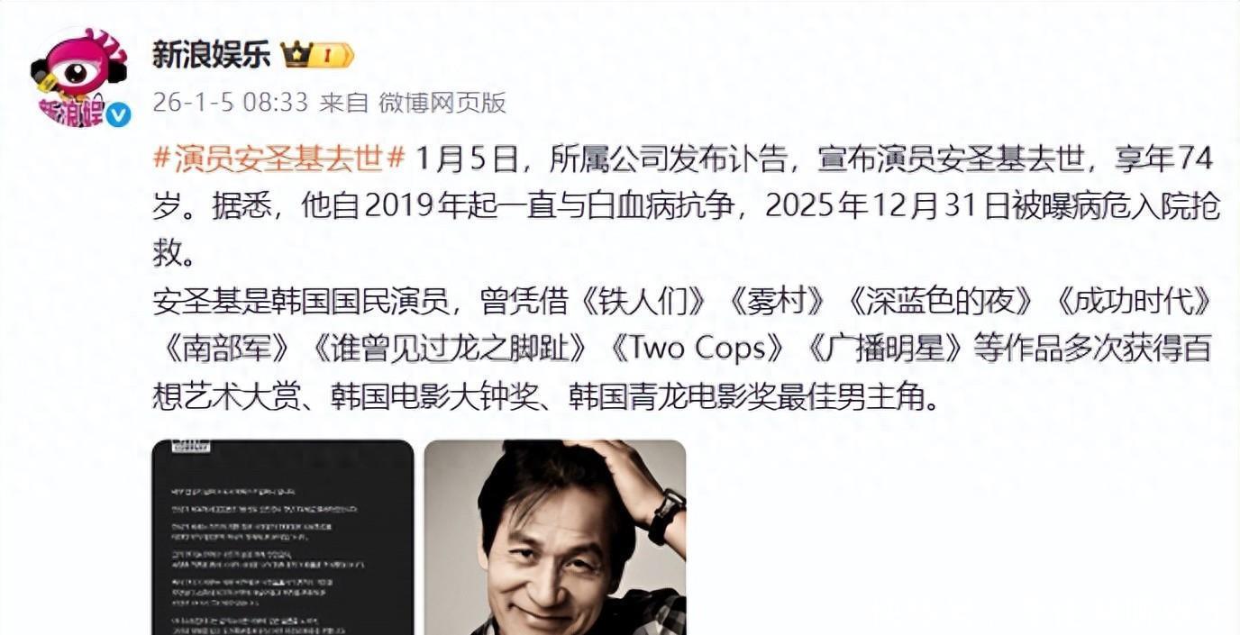 1月5日,韩国演员安圣基所属公司发布讣告,告示安圣基厌世,享年74岁。据悉,他自2019年起一直与白血病抵拒体育游戏app平台,2025年12月31日被曝病危住院抢救。