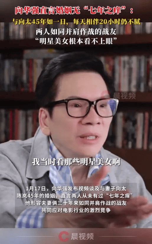 1月17日,向华强发视频聊和向太45年的婚配,这话也太圈粉了!他说俩东谈主从来莫得七年之痒,三十年来像战友相同并肩扛事,我方在文娱圈见遍好意思女却“目中无好意思女”,每天跟向太待20小时还不腻,直言这是掷中注定的因缘。