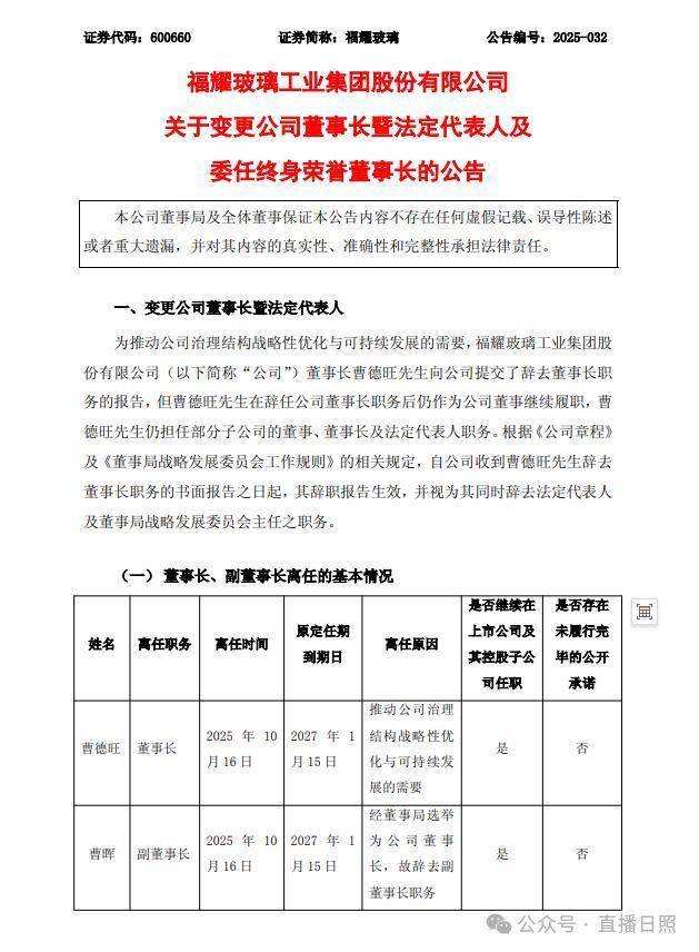 同期,公司选举曹晖为新任董事长,并任命其为法定代表东谈主及董事局策略发展委员会主任。曹德旺被委任为公司毕生荣誉董事长。这次职务变动不会对公司平时筹划行为产生不利影响。
