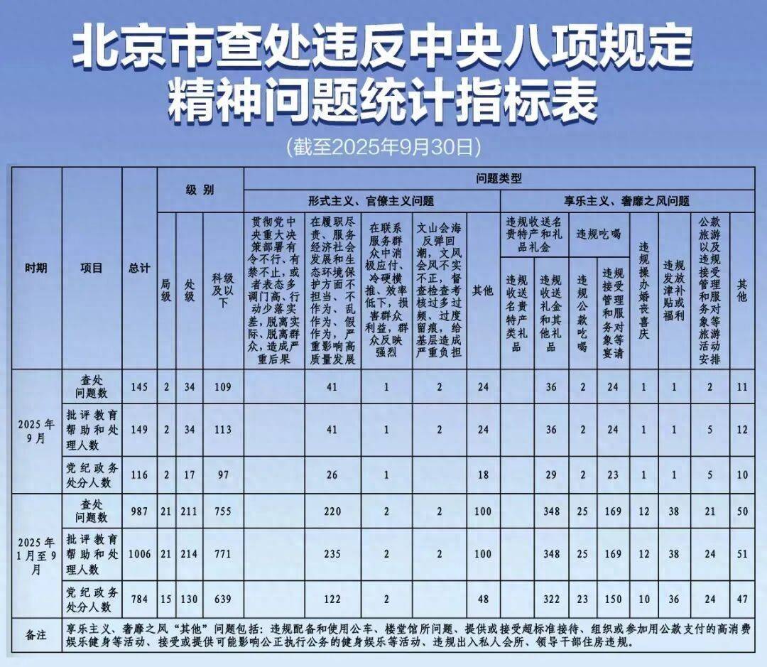 “清风北京”10月26日音信,日前,北京市纪委监委公布本年1月至9月查处违抗中央八项章程精神问题统计方针表。划定9月30日欧洲杯体育,累计查处违抗中央八项章程精神问题987起,月旦请示匡助和处理1006东谈主,其中局级21东谈主、处级214东谈主、科级及以下771东谈主。