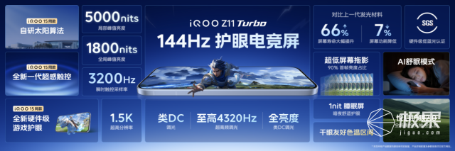护眼电竞屏,全天候陪同iQOO Z11 Turbo配备6.59英寸1.5K 144Hz护眼电竞屏,复古类DC调光、至高4320Hz超高频调光、全亮度类DC调光三重护眼决策,通过SGS硬件级低蓝光与低频闪认证,罢了全天候、全东说念主群、全场景护眼。