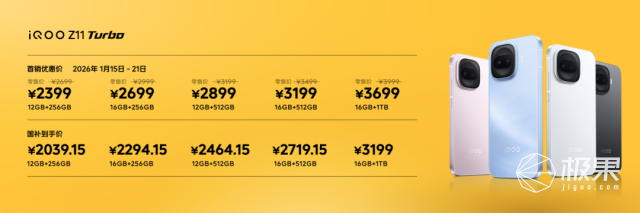 iQOO Z11 Turbo将于2026年1月15日崇拜开售,提供12GB+256GB、16GB+256GB、12GB+512GB、16GB+512GB、16GB+1TB五种存储版块,在1月15日~21日的首销期内下单,可享受300元官方优惠,重复国补后累计最多立减800元,具体如下: