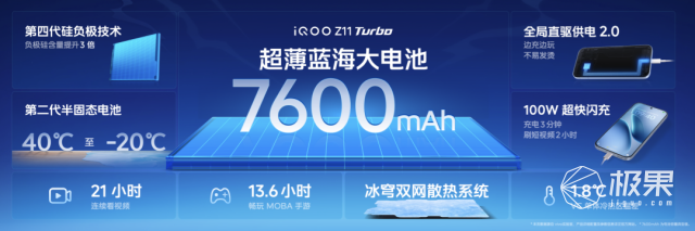 能量堡垒,信号孤岛iQOO Z11 Turbo内置7600mAh超薄蓝海大电板,经受行业率先的第四代硅负极时期,能量密度达iQOO全系最高的860Wh/L,续航才气远超同尺寸性能机。配合100W超快闪充与全局直驱供电2.0时期,边玩边充不发烫、不伤电板,一杯咖啡的期间即可回血过半。