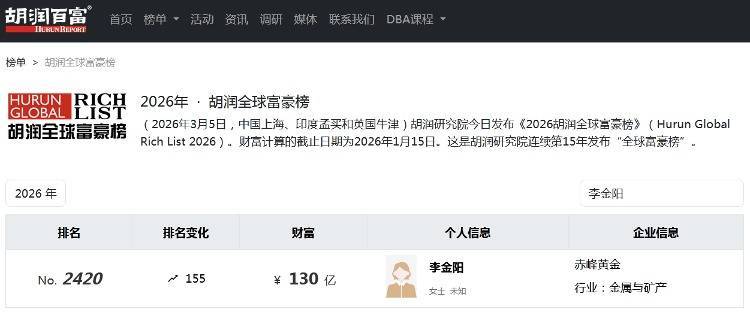 胡润相干院表现的2026年专家富豪榜表露,李金阳以130亿钞票位列专家第2420位,排行同比飞腾155位。