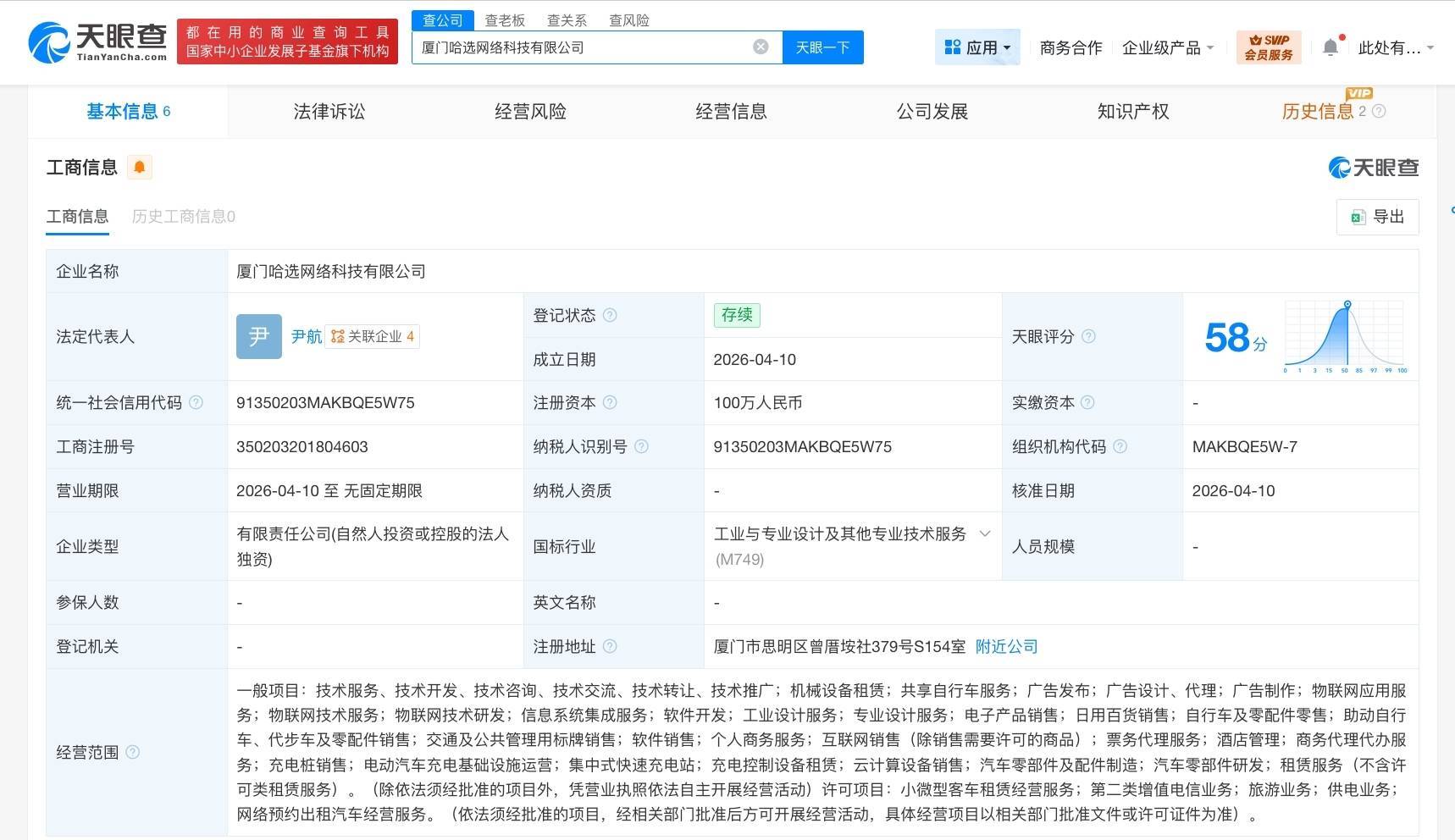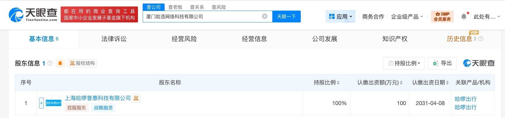 南边财经4月15日电,天眼查App走漏,近日体育游戏app平台,厦门哈选鸠合科技有限公司成立,法定代表东说念主为尹航,注册老本100万东说念主民币,筹算领域包括机械开导租出、分享自行车处事、物联网掌握处事、物联网时期处事、物联网时期研发、信息系统集成处事、互联网销售等。鼓舞信息走漏,该公司由上海哈啰普惠科技有限公司全资握股。